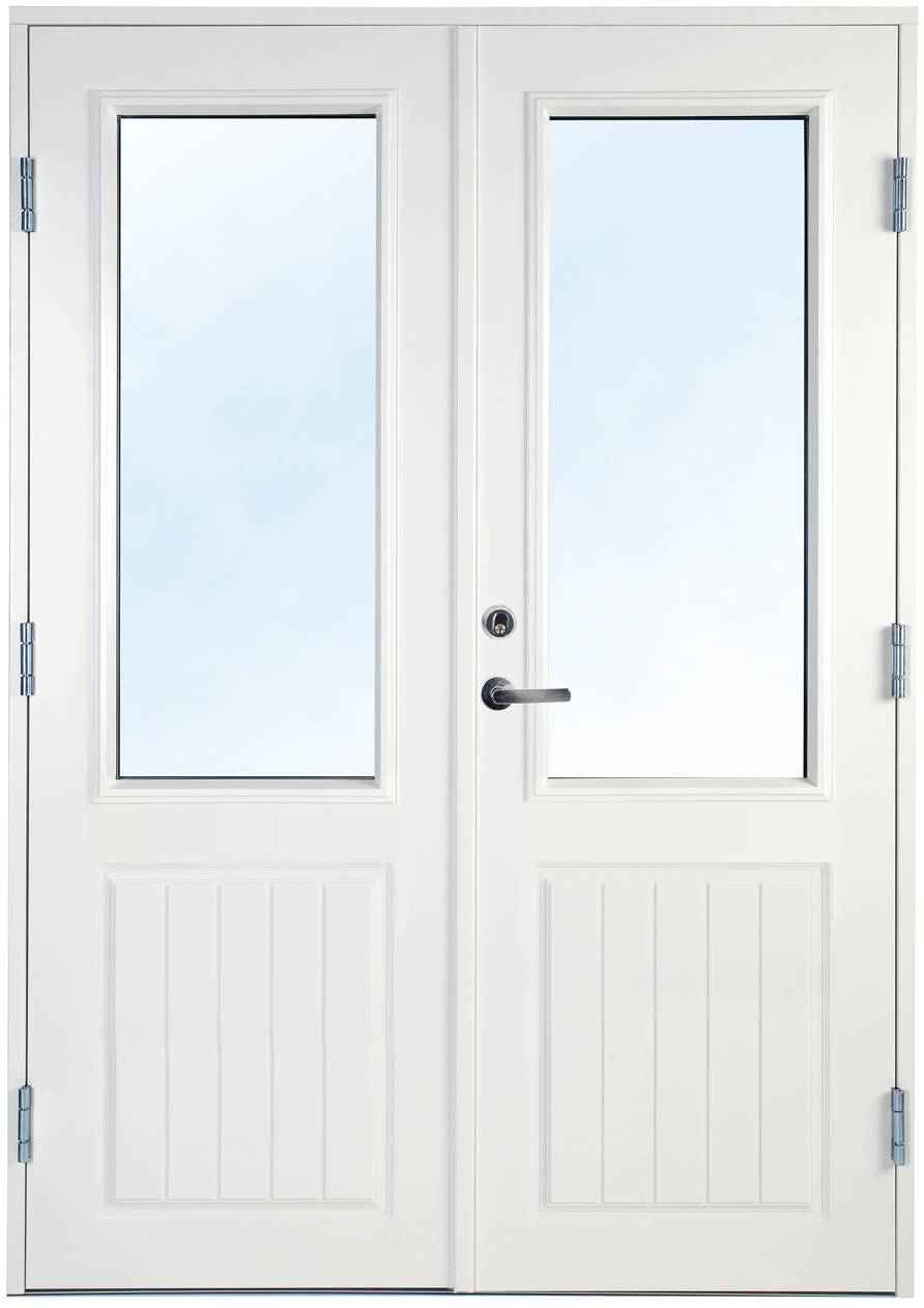 Dörrarna är dekorerade nedtill på både in- och utsida. Fönstrena är en 2-glas isolerrutor med Argon vilket ger ett lågt U-värde.