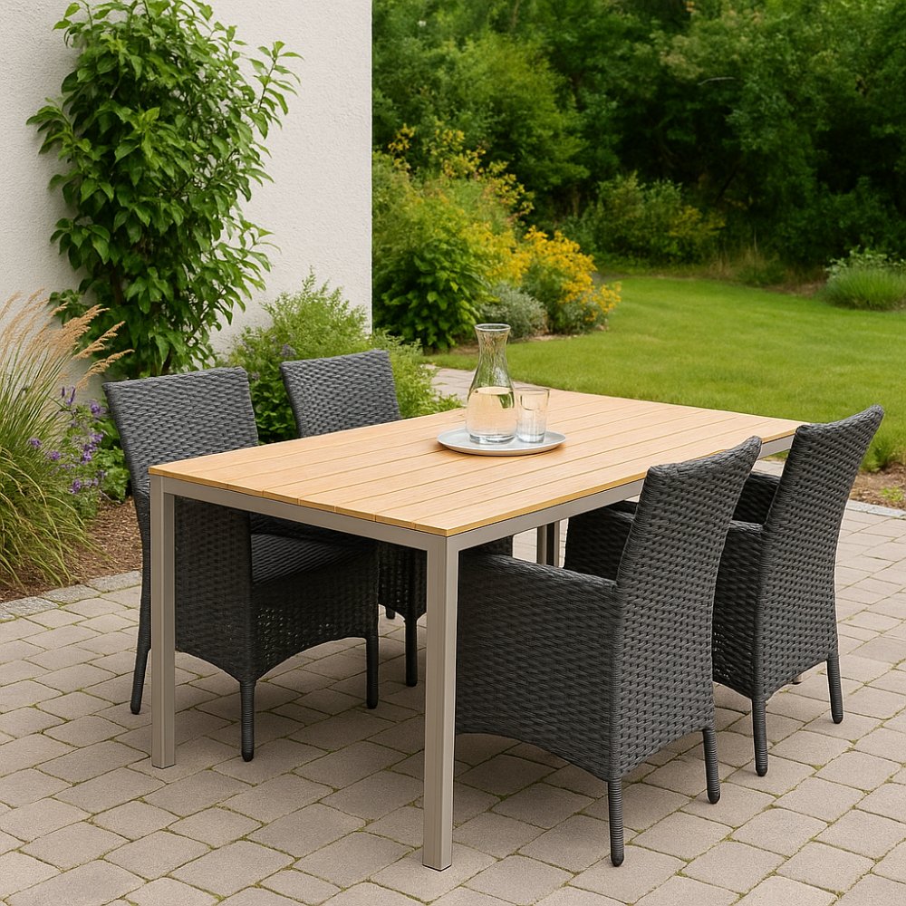 Stommen i pulverlackerad aluminium är både lätt och rostfri, medan bordsskivan i Aintwood erbjuder träkänsla utan krav på skötsel. Grå konstrotting på Ida-stolarna står emot både regn och UV-strålning, vilket gör gruppen optimal för nordiskt klimat och långvarigt bruk.