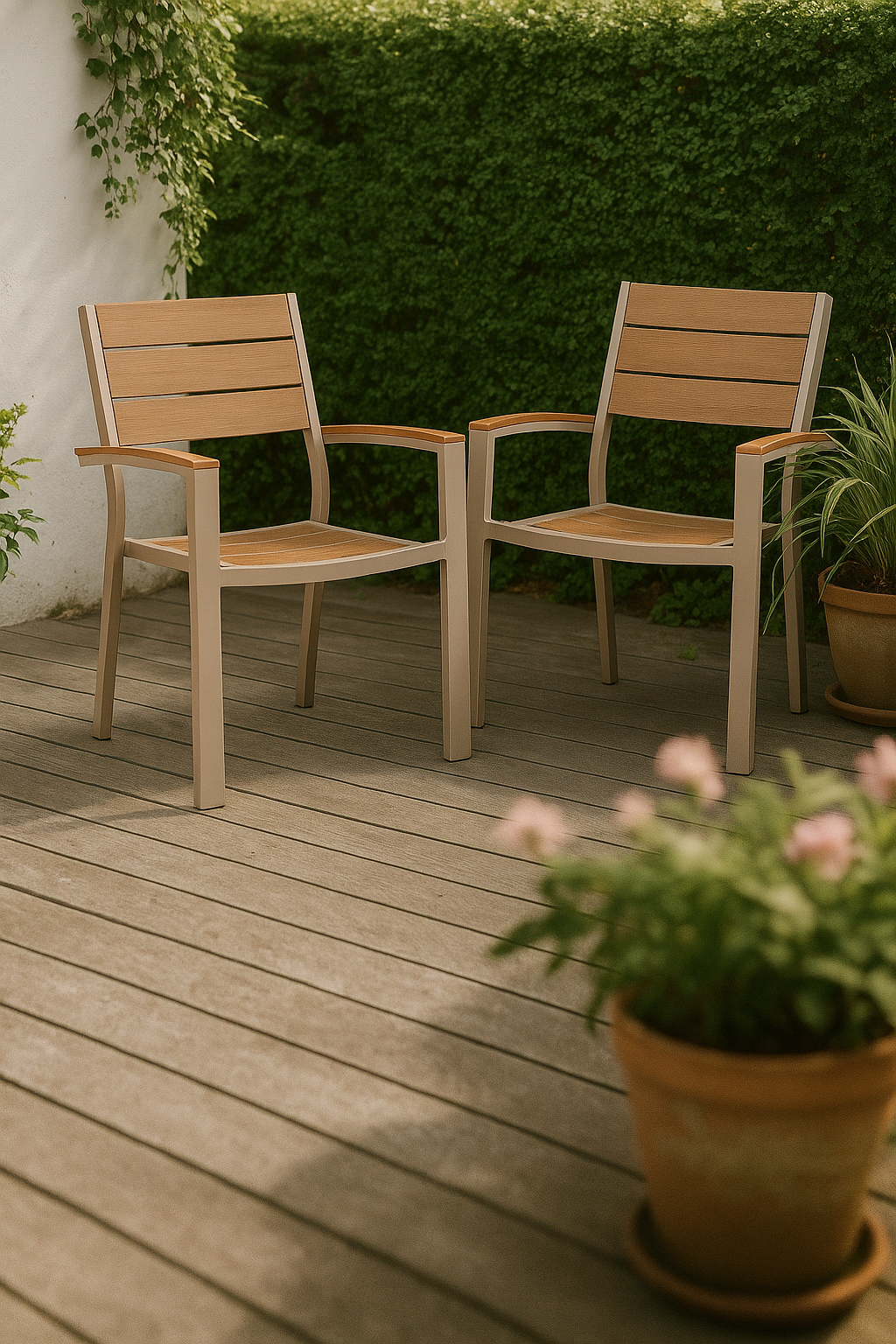 Den beigelackerade aluminiumstommen är lätt, rostfri och kräver minimalt med skötsel. Noonwood är ett tåligt plastmaterial med träkänsla, framtaget för att stå emot både sol, regn och temperaturskiftningar. Perfekt för dig som vill lägga mer tid på att njuta – och mindre på att underhålla.